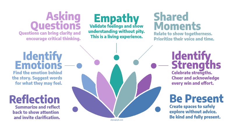 ⚛ Be Present: Create spaces to safely explore without giving direct advice.